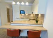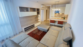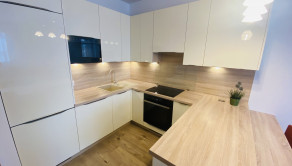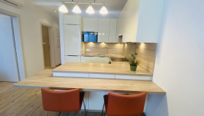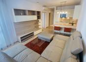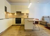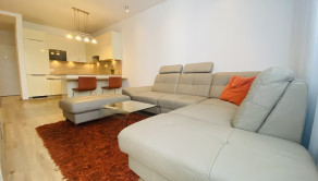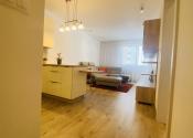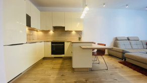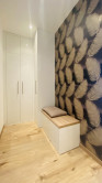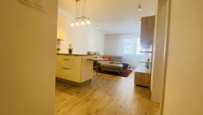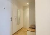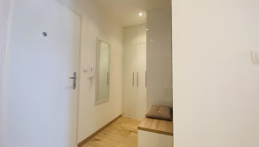 Pri vstupe do bytu sa nachádza vstupná chodba, ktorá disponuje množstvom úložného priestoru, z ktorej sa ide do obývacej izby spojenej s kuchyňou. Moderná kuchyňa je kompletne vybavená spotrebičmi značky whirpool. Je kvalitná a priestranná, s mmnožstvom úložného priestoru. Z obývacej izby a zo spálne je východ na loggiu s pekným výhľadom do tichej časti vnútrobloku.